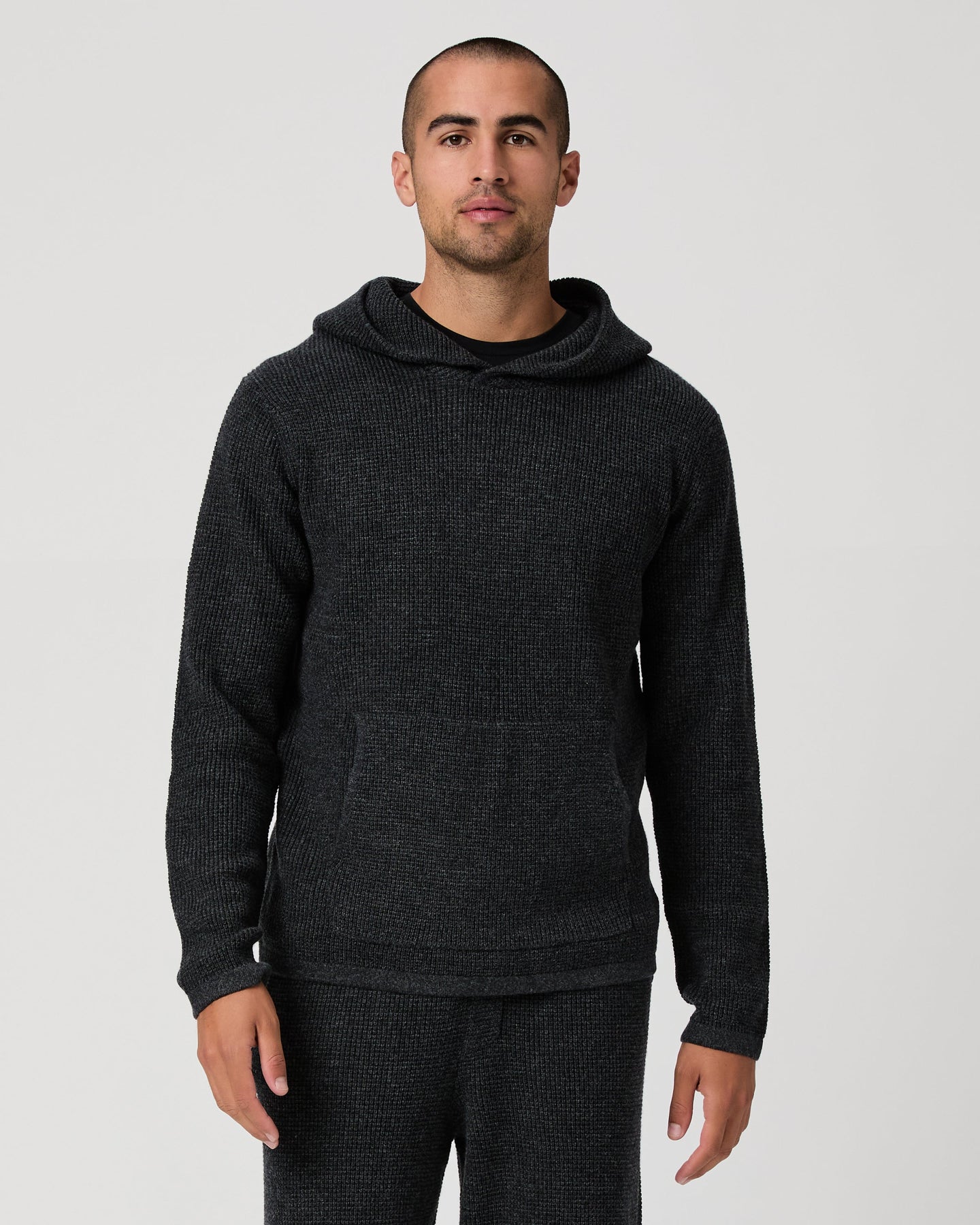 An update to our bestselling sweater hoodie, expertly constructed from our ultra soft cashmere merino wool blend. This waffle knit hoodie is designed with a front kangaroo pocket and comes in a dark charcoal grey hue. Pair the Ojai Sweater Hoodie with the matching Willits Sweater Pant for an instant outfit that's perfect for those casual, off-duty days.